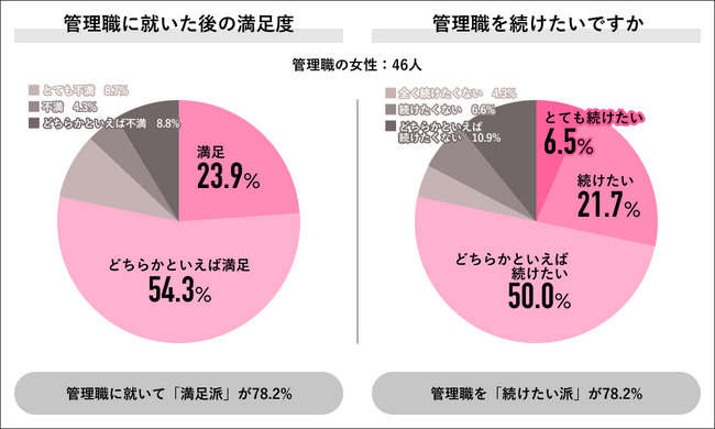 管理職女性の46人に満足度を聞くと、「満足」23.9%、「どちらかといえば満足」54.3%を合算した78.2%が”満足派”で過半数を占めました。一方”不満派”は21.8%でした。また、管理職の継続意欲を聞くと、「とても続けたい」6.5%、「続けたい」21.7%、「どちらかといえば続けたい」50.0%を合算した78.2%が”続けたい派”の回答をしました。一方”続けたくない派”は21.8%でした。