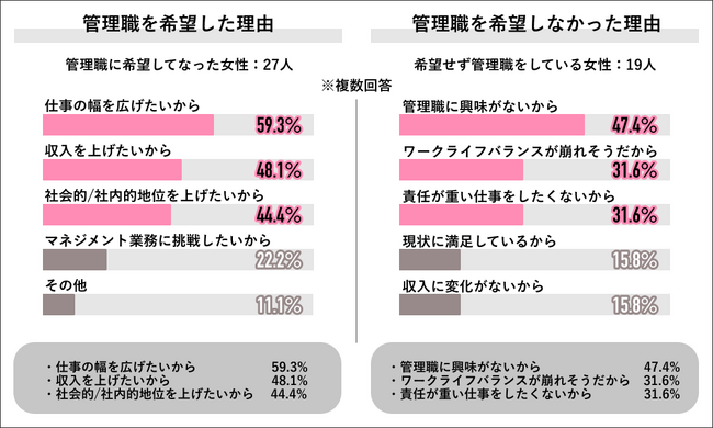 希望して管理職になった女性27人にその理由を聞くと、「仕事の幅を広げたいから」が59.3%で最多になり、次いで「収入を上げたいから」が48.1%、「社会的/社内的地位を上げたいから」が44.4%で上位3つの回答になりました。また希望せず管理職になった女性19人にその理由を聞くと、「管理職に興味がないから」が47.4%で最多回答になり、次いで「ワークライフバランスが崩れそうだから」「責任が重い仕事をしたくないから」が同率で31.6%となりました。