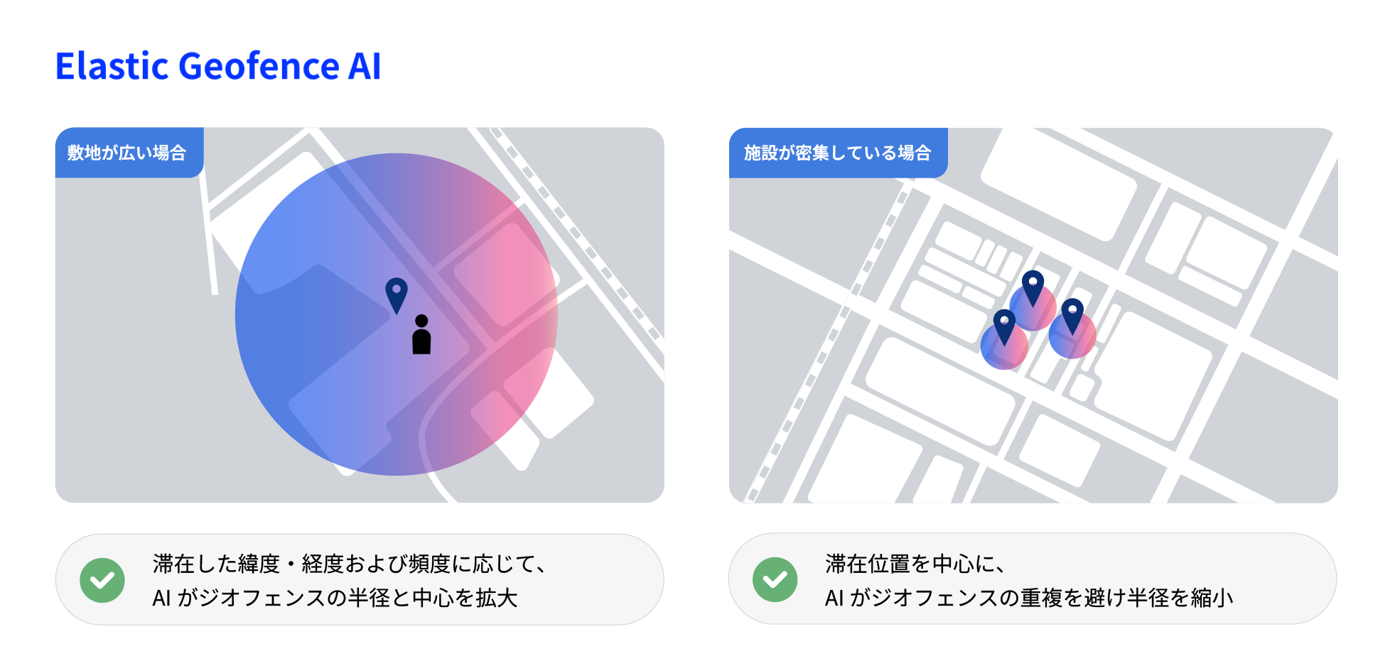 本技術では、ユーザーが活動した位置情報履歴と地理空間情報をAIが学習し、ジオフェンスの中心と半径をユーザーごとに最適化します。営業スタイルや担当者の訪問パターンに応じて、「Elastic」という名の通り検知範囲を伸縮自在に最適化できる点が特長です。これにより現場での活動情報が、実態に即してより正確に自動記録されるようになります。