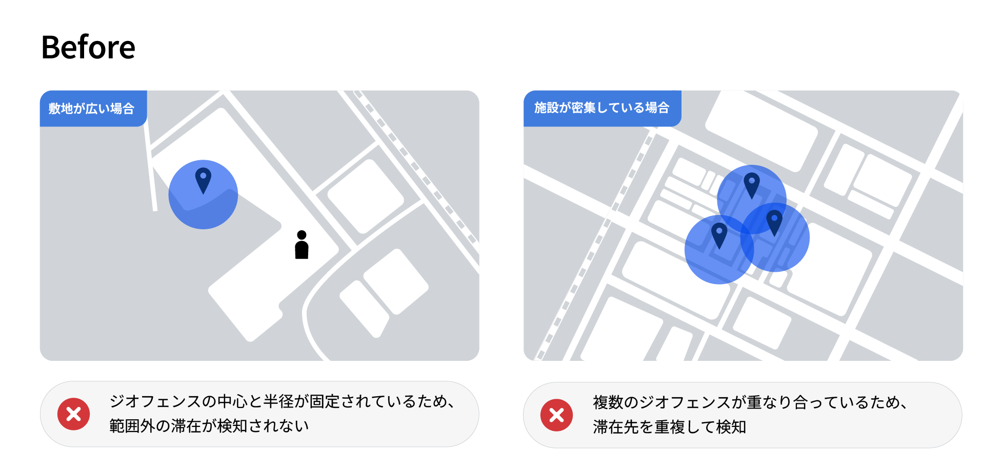 しかし、ジオフェンスの中心や半径が固定されていた従来の技術では、実際の敷地面積・密集度や訪問パターンによって、手動での修正が必要になる場面がありました。