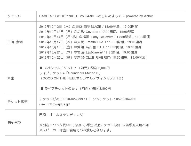昨年11月に始動したユニバーサル ミュージックとの共同ライブプロジェクトを「Anker × Universal Music Special Live」に改め、リニューアルローンチ。通算3回目、リニューアルローンチ後初となる今回は5人組ロックバンド「GOOD ON THE REEL」とタッグを組み、全国7都市を巡る1年半ぶりのワンマンツアーを開催致します。