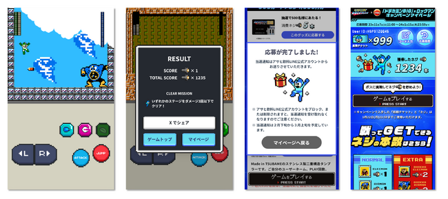 ゲームに参加することで、勝敗に関わらずネジ(ポイント)を獲得できます。ネジを貯めて、「ロックマン」シリーズに登場した「E缶」風のタンブラーや、E缶デザインのスツール、QUOカードPayなどの賞品に応募することが可能です。