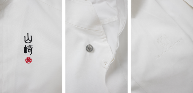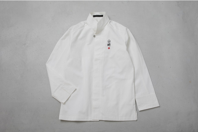 機能面としては、肩の切り替えがあることで動きやすさに繋がっており、盛り付け時の邪魔にもなりません。丈感もちょうどよく、山崎さんがこだわってつけたシルバーのボタンもワンポイントになっています。