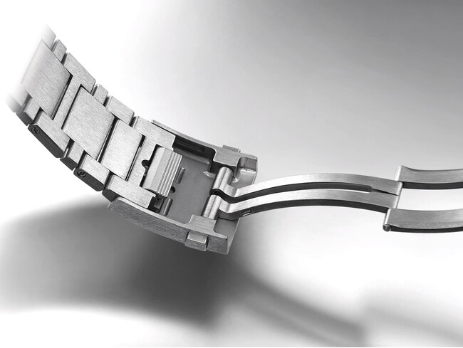 ブレスレットのリンク部に巧みに彫刻された模様は、ケースに施した洗練を極める仕上げ加工と完璧にマッチしているだけでなく、腕に着けたときの装着感を最適にする役割も果たしています。ツールを使わずにストラップを交換できるシステムは特許を取得しており、ラグの裏側に組み込まれたシングルプッシュボタンを押すと、ブレスレット、ラバーストラップ、アリゲーターストラップのいずれにも簡単に交換することができます。また腕周りの微調整に関しても専用の工具は必要ありません。