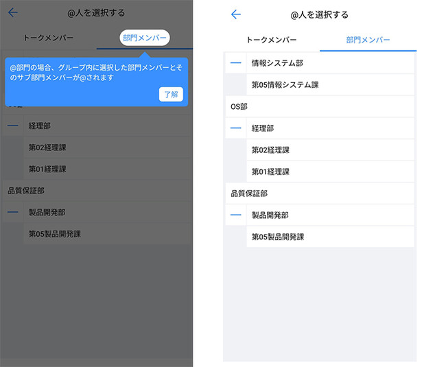 WowTalkの利便性向上を目的として、グループトークのメンション機能の宛先に、部門を選択できる機能を追加しました。