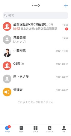 宛先に設定された部門メンバーは、トークリストの表示画面において、受信したトークルームに「@私」と表示され、対象のメッセージが強調された形で表示されます。