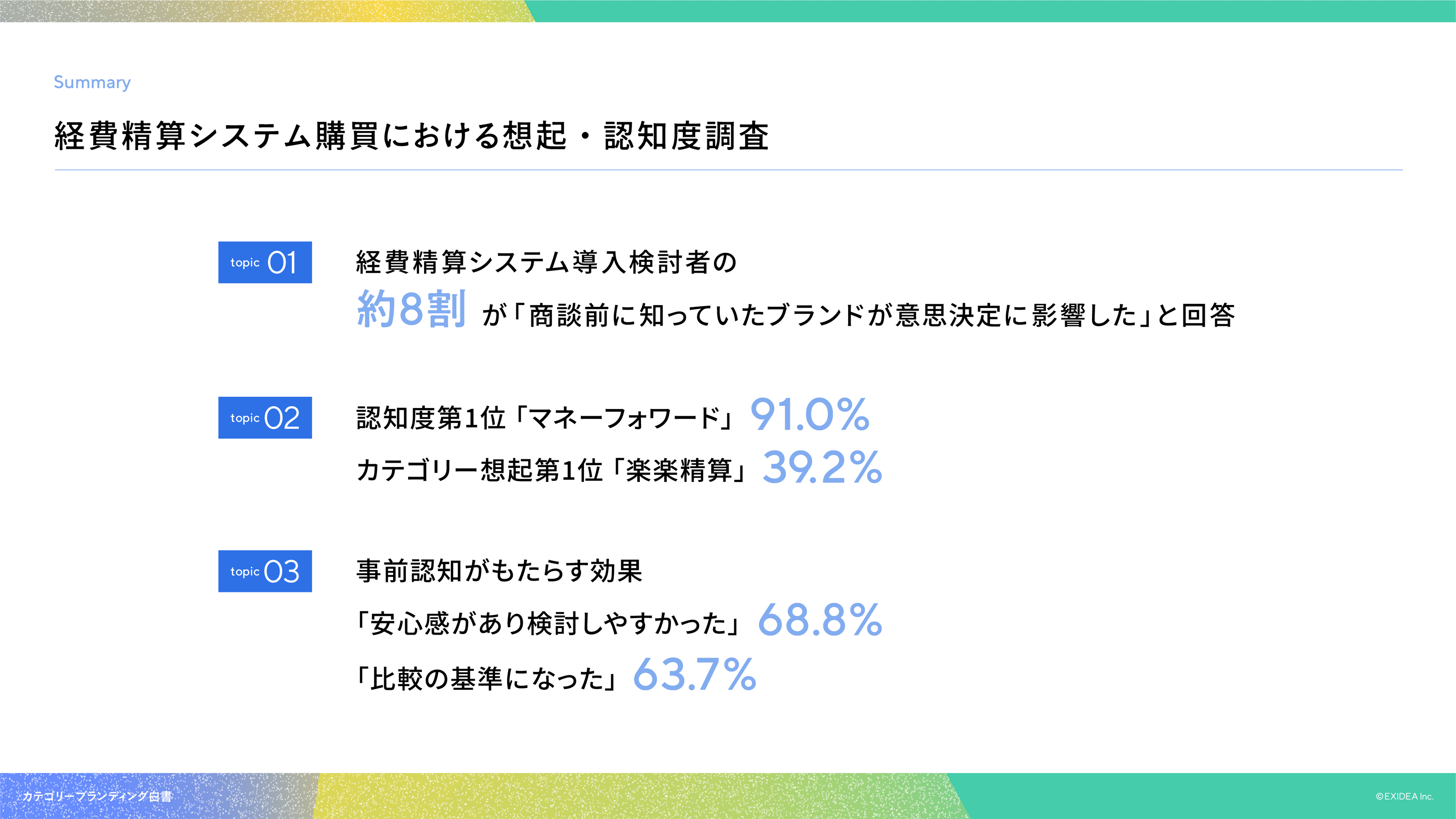 【カテゴリーブランディング白書 vol.1】「認知」と「想起」の深い溝。認知度1位はマネーフォワード(91.0%)も、想起では楽楽精算がトップに。BtoB購買の8割を左右する「0次選考」の正体とは?