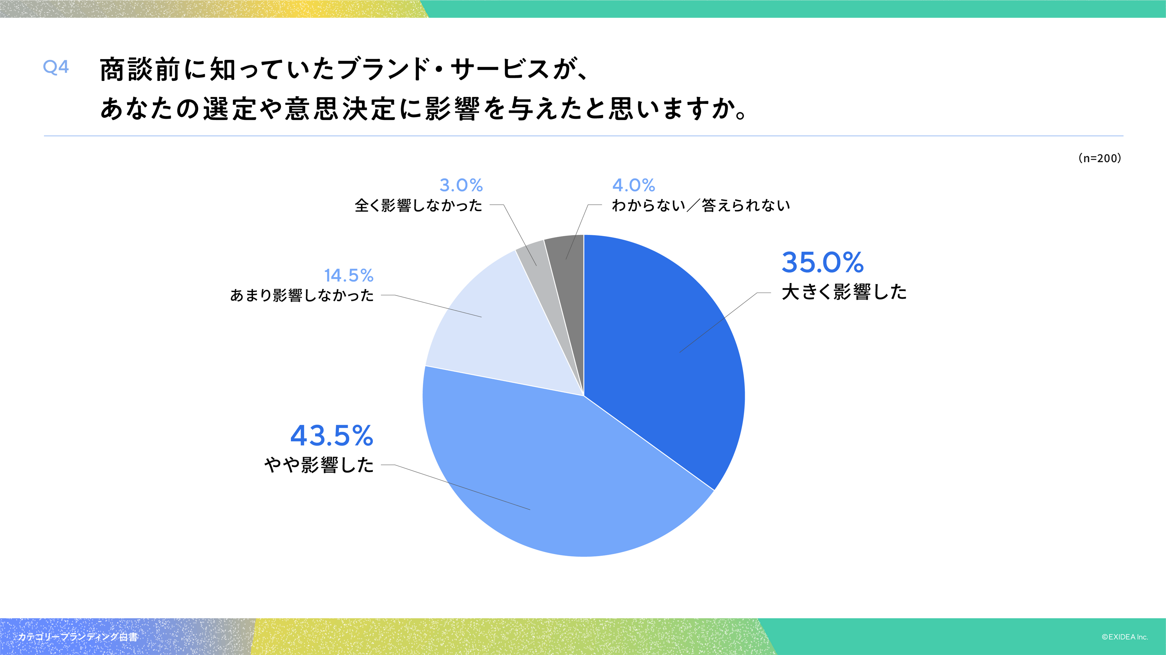 「Q4.商談前に知っていたブランド・サービスが、あなたの選定や意思決定に影響を与えたと思いますか。」(n=200)と質問したところ、「大きく影響した」が35.0%、「やや影響した」が43.5%という回答となりました。*本設問は、会計クラウド編と調査対象者および調査が同一のため、同じ内容となります。