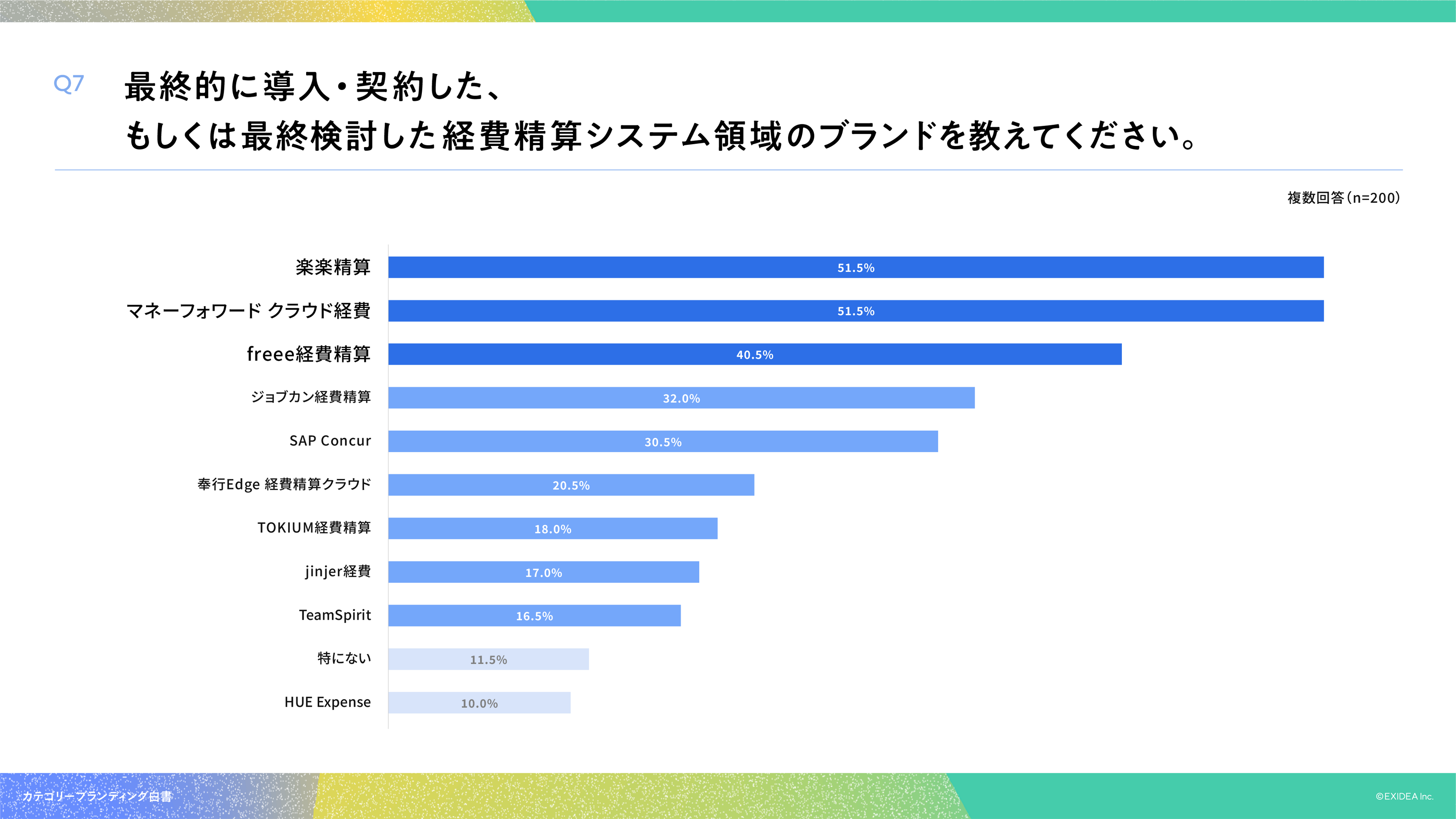 「Q7. 最終的に導入・契約したもしくは最終検討した経費精算システム領域のブランドを教えてください。(複数回答)」(n=200)と質問したところ、「楽楽精算」が51.5%、「マネーフォワード クラウド経費」が51.5%、「freee経費精算」が40.5%という回答となりました。