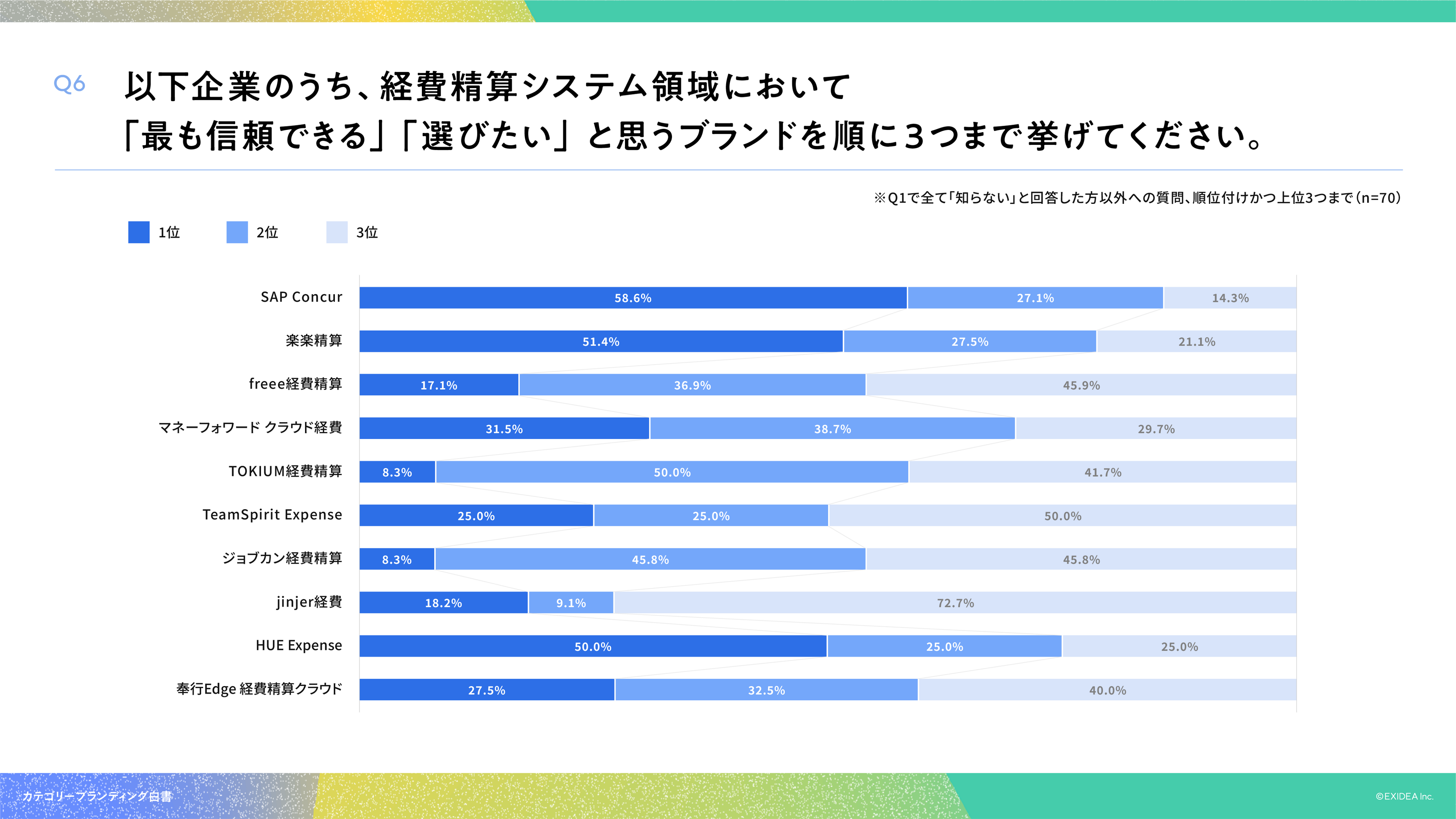 「Q6. Q1で全て「知らない」と回答した方以外にお聞きします。以下企業のうち、経費精算システム領域において「最も信頼できる」「選びたい」と思うブランドを順に3つまで挙げてください(順位付けかつ上位3つまで)」(n=70)と質問したところ、SAP Concurは「1位」が58.6%、楽楽精算は「1位」が51.4%、HUE Expenseは「1位」が50.0%という回答となりました。*なお、本調査では、回答者に対して、経費精算システム領域において「最も信頼できる」「選びたい」と思うブランドを、提示した10ブランドの中から最大3つまで選択し、1位から3位までの順位をつけて回答いただきました。