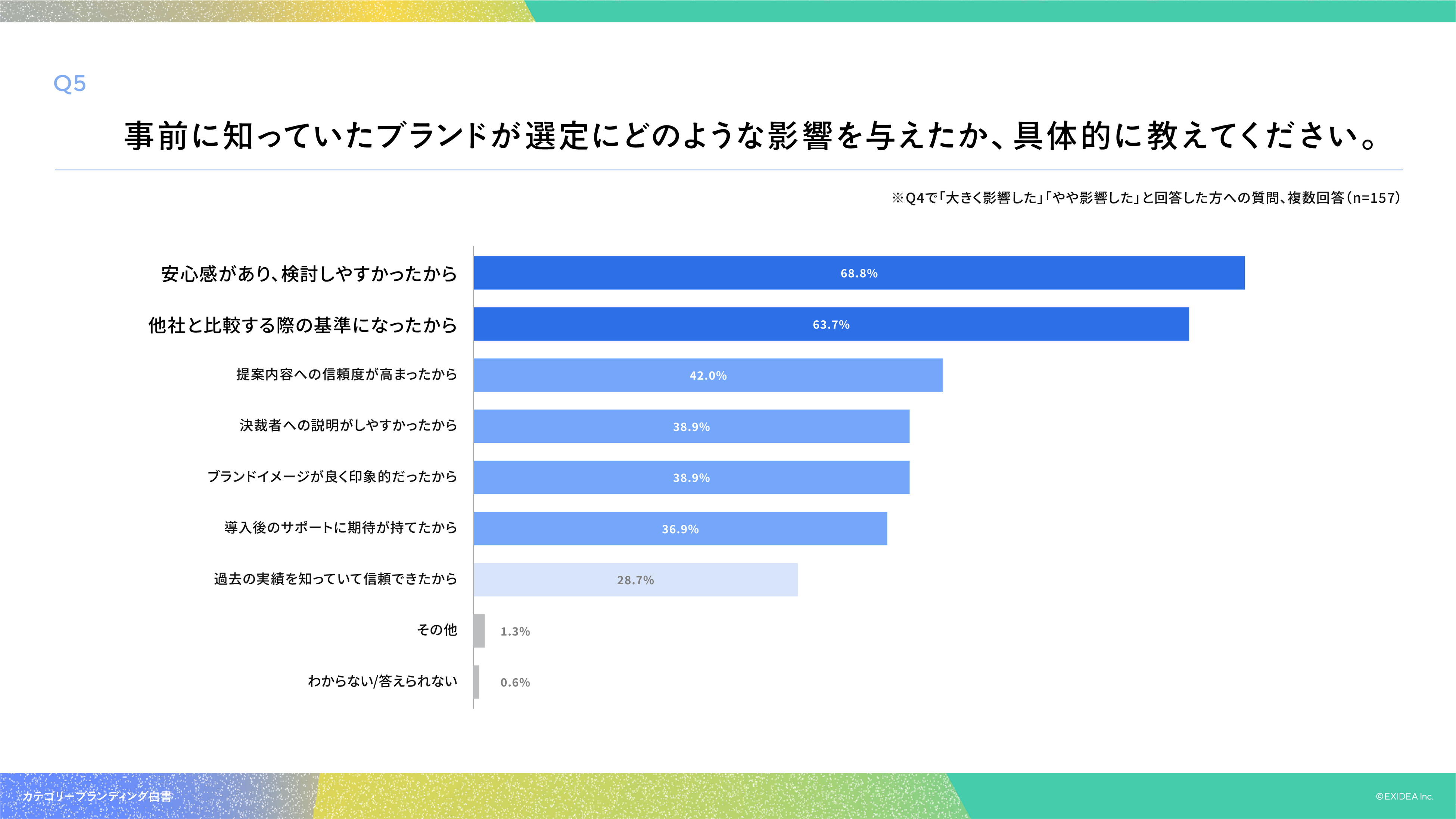 「Q5. Q4で「大きく影響した」「やや影響した」と回答した方にお聞きします。事前に知っていたブランドが選定にどのような影響を与えたか、具体的に教えてください。(複数回答)」(n=157)と質問したところ、「安心感があり、検討しやすかったから」が68.8%、「他社と比較する際の基準になったから」が63.7%、「提案内容への信頼度が高まったから」が42.0%という回答となりました。*本設問は、会計クラウド編と調査対象者および調査が同一のため、同じ内容となります。