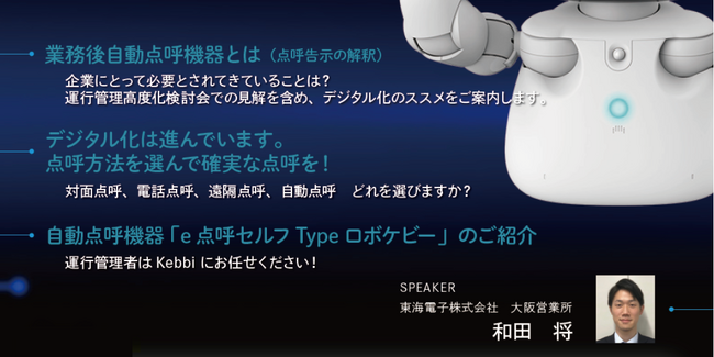 アルコール検知システム、 IT点呼システム、 運行管理システムを開発・販売する東海電子株式会社(本社:静岡県富士市 代表取締役 杉本 哲也)は、 この度、 「ロボットが運行管理者になります!e点呼セルフTypeロボケビー新製品発表セミナー 」を6月21日(水)に無料開催いたします。