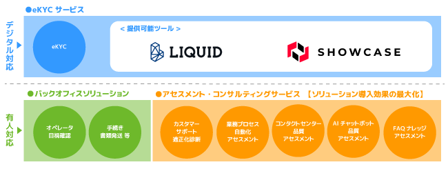 なお、本ソリューションは、株式会社Liquid(本社:東京都千代田区、代表取締役:長谷川敬起)の「LIQUID eKYC」および株式会社ショーケース(本社:東京都港区、代表取締役社長:永田豊志)のカンタンeKYC「ProTech ID Checker」と、KDDIエボルバのバックオフィスセンターの業務設計・運用をハイブリッドに提供するものです。