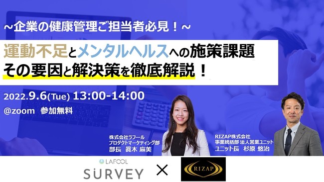「個人が変われば、 組織が変わる」組織改善サーベイ「ラフールサーベイ」を提供するウェルビーイング/人的資本経営支援の株式会社ラフール(本社:東京都中央区、代表取締役社長:結木啓太、以下「ラフール」)は、RIZAP株式会社(本社:東京都新宿区、代表取締役社長:瀬戸 健、以下「RIZAP」)と『ニューノーマル時代の「心と体の健康管理」 各社が抱える課題と対策を徹底解説!』をテーマとした共催セミナーを2022年9月6日(火)に開催します。
