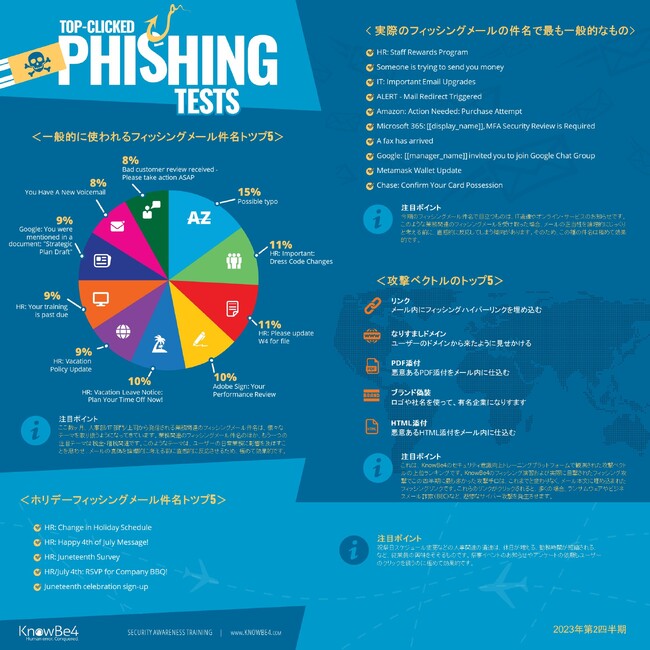 2023年第1四半期の「要注意件名」統計レポートのポイントをまとめたPDFを希望する方は、https://www.knowbe4.com/hubfs/J_Q22023-Phishing-Report-Graphic.pdfをクリックしてください。