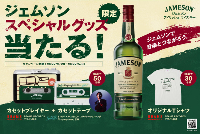 また本コラボレーションを記念して、ジェムソン限定スペシャルグッズが当たるキャンペーンも実施します。今回、「音楽のある豊かな暮らし」を提案するBEAMS RECORDSが「ジェムソン」の想いに賛同し、グッズのデザインを監修。SIRUPの楽曲「Superpower」を収録したカセットテープやオリジナルカセットテーププレイヤー他、「ジェムソン」を音楽と共にお愉しみいただくのにぴったりな限定スペシャルグッズをご用意しました。