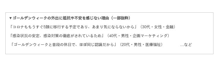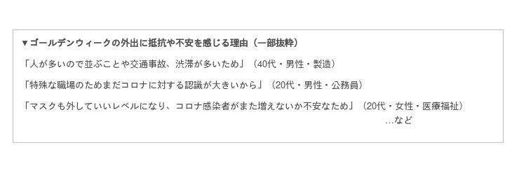ちなみに、ゴールデンウィークの外出に抵抗や不安を感じると回答した人にその理由を聞いたところ、「人が多く、どこも混雑するから」(40代・男性・企画マーケティング)といった、そもそも人混みが苦手という大多数を占める中、「人が混雑している場所では新型コロナがまだ気になるから」(30代・男性・営業)、「人混みでコロナが蔓延しそう」(40代・女性・コールセンター)など、人混みでのコロナ感染を危惧する声も少なくありませんでした。