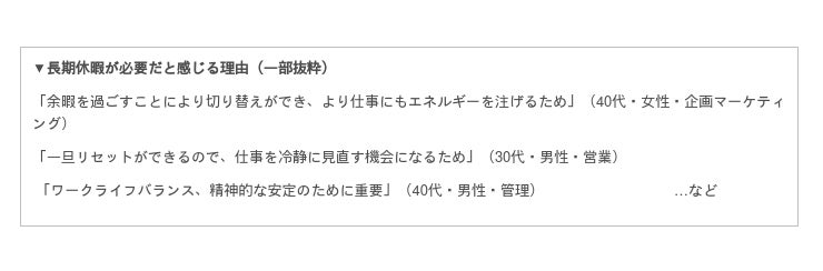 長期休暇が必要だと感じる理由としては、「気持ちをリフレッシュし、体をゆっくりと休めることは仕事へのモチベーションアップにも繋がると思うから」(30代・男性・営業)、「休息がなければスキルアップできないどころか最低限のパフォーマンスも保てないため」(20代・女性・建築土木)といった意見が多数挙がりました。多くの働き手が、仕事に励むためのリフレッシュ期間として長期休暇の必要性を感じているようです。