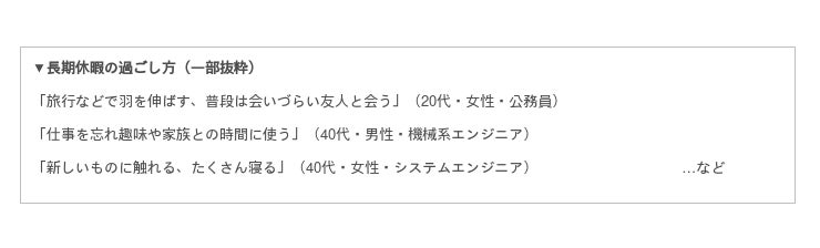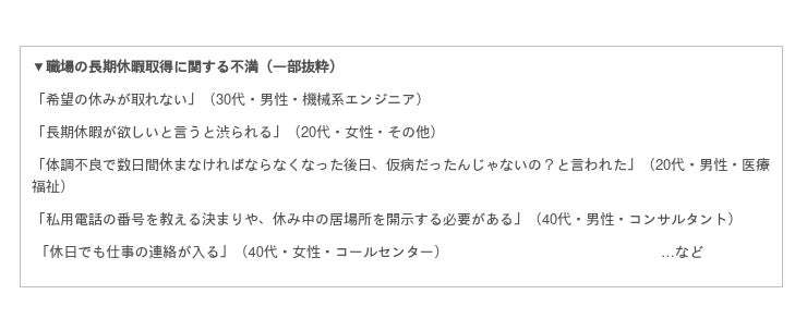 具体的にどのような不満があるか聞いたところ、「従業員数が足りず、長期的な休暇をとれない」(30代・男性・事務)、「長期休暇が取りづらい」(20代・女性・製造)など、主に長期休暇の取得が難しいという意見が挙がりました。中には「取得に対して、嫌な顔をされる」(40代・男性・運輸交通)というような意見も複数あり、長期休暇の取得ができないわけではないものの、実際には気軽に取得できない状況にいる人も少なくないことが分かりました。