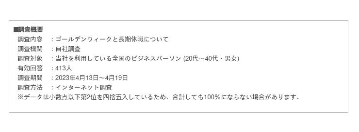 今年もいよいよゴールデンウィークを迎えます。このところ、新型コロナの5類移行決定やマスク着用のルール変更など規制緩和が進んでおり、3月に実施した調査(※)では4割近くの人の働き方が変化したという結果も出ていますが、働き手のプライベートにも影響はあるのでしょうか。今回は、目前に迫るゴールデンウィークの過ごし方や長期休暇に対する考え方に変化が生まれているのか調査を実施しました。