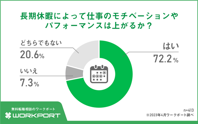 次に、対象者全員に長期休暇の過ごし方で仕事のモチベーションやパフォーマンスが上がると感じるか聞いたところ、72.2%の人が「はい」と回答しました。