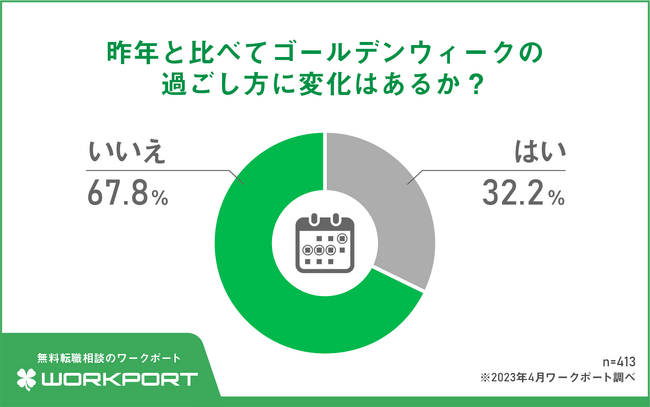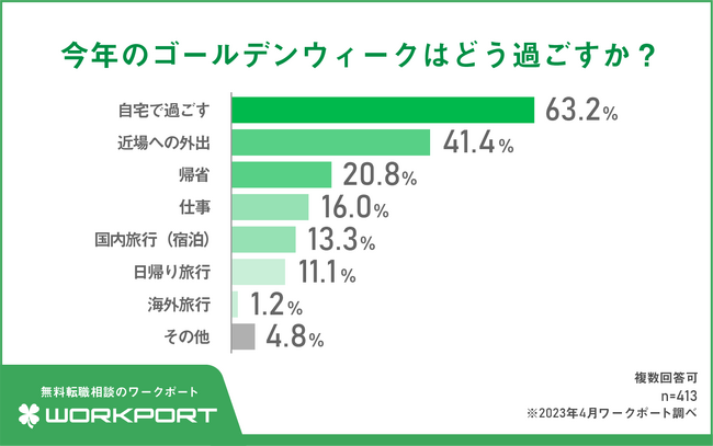 総合転職エージェントの株式会社ワークポート(所在地:東京都品川区、代表取締役社長:林 徹郎)は全国のビジネスパーソン413人(20代〜40代・男女)を対象に、コロナ規制緩和下の「ゴールデンウィークと長期休暇」についてアンケート調査を実施しました。