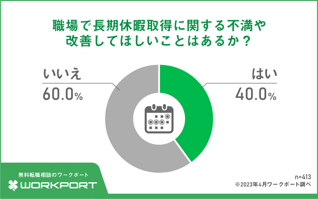 さらに、対象者全員に職場で長期休暇取得に関する不満や改善してほしいことはあるか聞いたところ、40.0%の人が「はい」と回答しました。