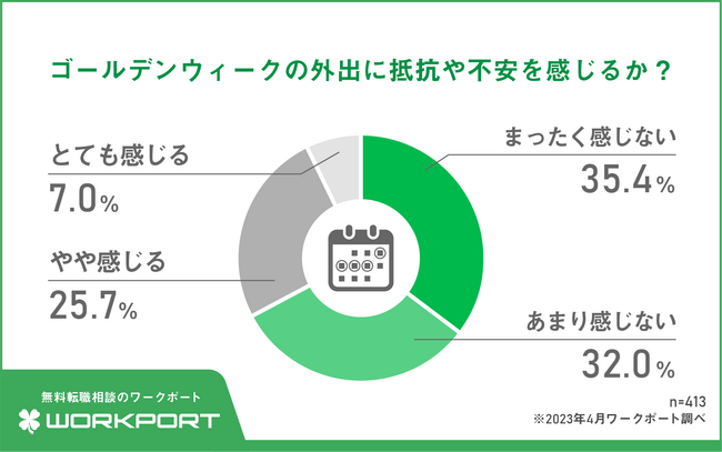 さらに、対象者全員にゴールデンウィークに外出することに抵抗や不安を感じるか聞いたところ、「まったく感じない」(35.4%)、「あまり感じない」(32.0%)が合わせて67.4%となり、7割近くの人が連休中の外出に抵抗感を持っていないことがわかりました。