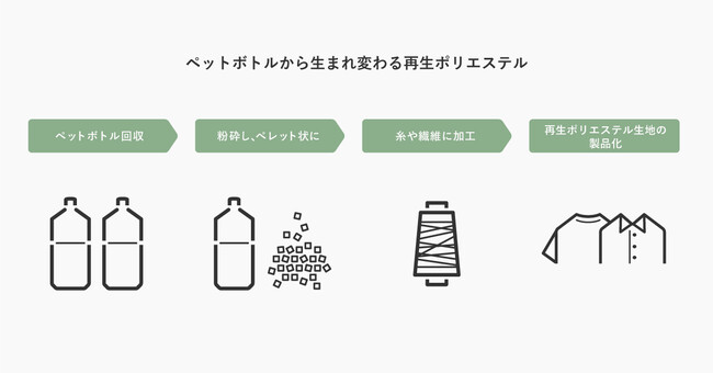ポリエステルを繊維化するときには、「ポリエチレンテレフタラート(PET)」という物質を原料にします。このPET(ペット)は、ペットボトルの原料と同じで、廃棄されるペットボトルや繊維屑をリサイクルすることで生まれるのが「再生ポリエステル」です。