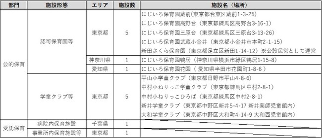 事業内容:認可保育園である『にじいろ保育園』をはじめ、学童クラブ・児童館等、様々な形態の保育施設を運営する「公的保育サービス」、事業所内保育施設(企業・病院・大学等)の運営を受託する「受託保育サービス」を提供。
