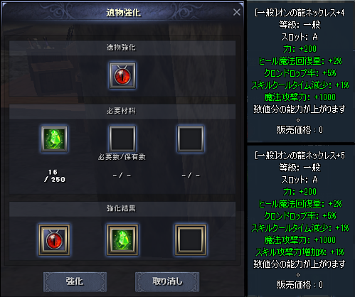 一般等級〜伝説等級までの等級が設定されていて上位の遺物ほどオプション補正が高くなり、最大5段階までの強化を行うことで「遺物」の種類ごとに設定されているオプションが追加されていきます。