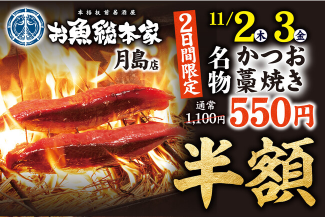 なお、月島店の開店を記念し、11月2日(木)・3日(金)の2日間限定で、看板メニューの「かつお藁焼き」(通常1,100円)を“半額”の550円にて提供するイベントを実施します。ぜひ、この機会に板前ライブと藁焼きの美味しさを体感してください。