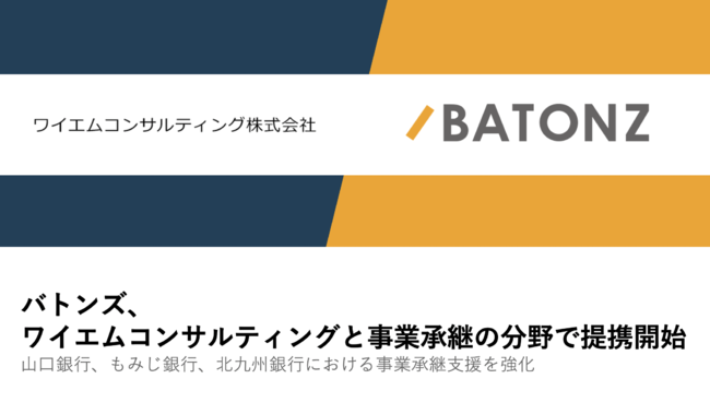 M&A総合支援プラットフォーム「BATONZ(バトンズ)」を運営する株式会社バトンズ(本社:東京都中央区、代表取締役:神瀬 悠一、以下バトンズ)は、ワイエムコンサルティング株式会社(本社:山口県下関市、代表取締役社長:久保 哲秀、以下ワイエムコンサルティング)と中小企業における第三者承継・M&Aを支援するための提携を開始したことをお知らせします。