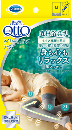・【メディキュット ネイチャーヒーリング ソックス(TM)】 「森林浴」から着想!天然素材配合のやわらかい履き心地。履いて寝る習慣で身も心もリラックス(※1)、へ導く新コンセプトのメディキュット