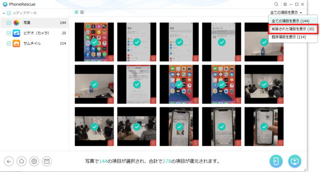 Step 5: リカバリーしたい写真を選択して、「iPhone」または「パソコン」を復元してください。