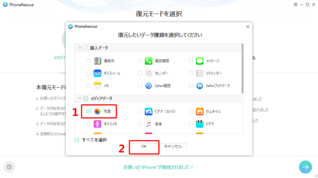 Step 2: 次のようなポップアップが出たら、全ての選択を解除し、「写真」のみを入れます。