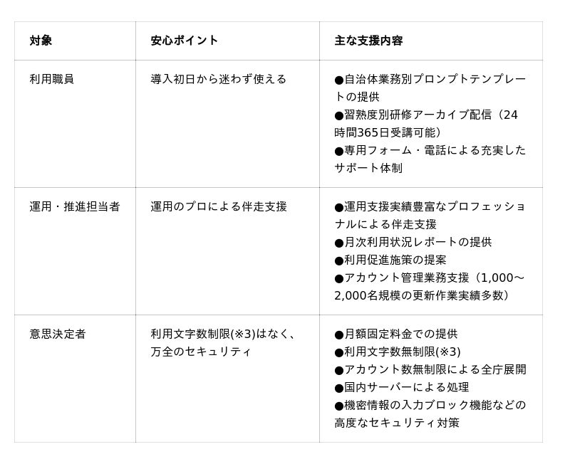 - 使い放題言語モデルを標準搭載:文字数上限を気にせず、全職員の積極的なAI活用を促進(※3)