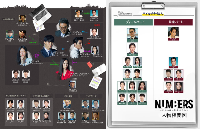 キム・ミョンス(INFINITE/エル)と共に協力しストーリーを盛り上げるのは、テイル会計法人のハン・ジェギュン(チェ・ミンス)副代表の一人息子であり、すべてが完璧なハン・スンジョ役を演じるチェ・ジニョク。元MOMOLANDヨンウは2022年に「2022 MBC演技大賞」で新人賞を獲得しており、チャン・ホウ(キム・ミョンス)の指導役となるチン・ヨナ役を務めた。緊迫した物語に加えホウとのロマンスもあり、ストーリーに緩急があり引き込まれていくこと間違いなし!また、俳優チェ・ミンスがスンジョ(チェ・ジニョク)の父親であるハン・ジェギュン役を熱演!劇中で彼は、テイル会計法人のすべての秘密と情報を握る重要な役を圧倒的なカリスマ性で演じ切り、本作の完成度をぐっと高めている。