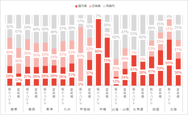 「遊園地・テーマパーク」人気を後押ししたのが、2022年10月から行われてた経済産業省「イベント割」です。遊園地やテーマパークを訪れたゲストのうち、約3割がイベント割を活用して出かけていることが明らかとなりました。また、一部地域では、イベント割を活用している来場者が他来場者に比べて遠方から訪れていることから、