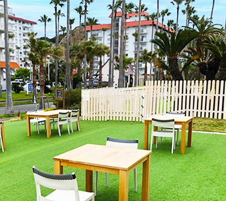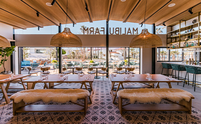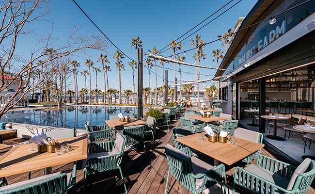 『マリブファーム 逗子マリーナ』では、現地の人気メニューの他、地元湘南の新鮮野菜や相模湾の魚介類を使用した日本限定メニューもご用意しています。全開可能なサッシによりテラス席と内部が一体となる設えで、約50席の屋内席の他、マリーナの海から繋がるような大きな水盤が広がる約80席のテラスには、三方を水に包まれたウォーターテラス席や、暖炉を囲むファイヤーテラス席などシチュエーションに応じてお使いいただけます。豊富なテラス席を有するため、ペット同伴でのお食事に最適なレストランです。