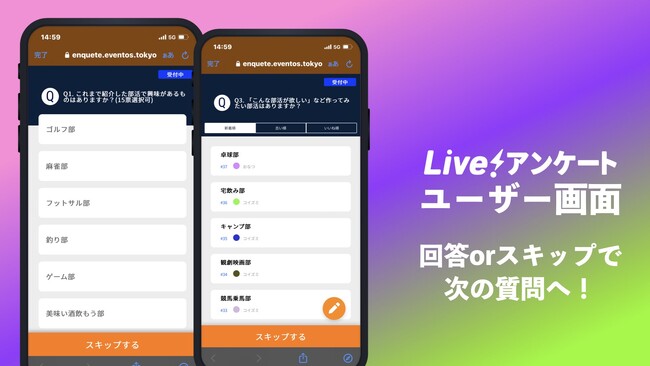 タイトル : Live!アンケートジャンル : Webサービス推奨環境 : Chrome、safari アクセス : https://enquete.eventos.tokyo/
