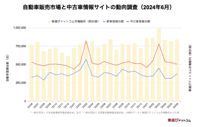 株式会社ファブリカホールディングス(本社:東京都港区、代表取締役社長CEO:谷口政人)の完全子会社、株式会社ファブリカコミュニケーションズ(本社所在地:愛知県名古屋市中区、代表取締役社長CEO:谷口 政人)が運営する中古車情報サイト「車選びドットコム(https://www.kurumaerabi.com/)」より、2024年6月における自動車登録台数の推移と、中古車情報サイト「車選びドットコム」の販売台数推移から、中古車市場の動きをまとめたレポートをご案内いたします。