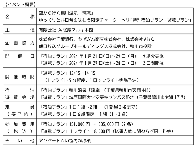 本実証事業では、新たな旅行需要の発掘を目的として、鴨川市や鴨川市地元観光事業者との連携のもと、鴨川温泉「璃庵(りあん)」までの旅路にヘリコプターを利用することで“空”からアクセスして非日常を味わえる「特別宿泊プラン」と、雄大な鴨川の自然を空から眺める期間限定「特別遊覧プラン」を実施します。