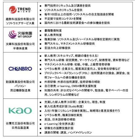 台湾では「会社の良し悪しは、会社の教育訓練を見ればわかる」と言われているほど、台湾人は「OJT」や「Off-JT」を非常に重要視しています。特に優秀な人材は、仕事で成長を感じられない、これ以上のスキルアップが見込めないと感じると、転職の要因になりかねません。一方で、ワイズコンサルティンググループの市場調査会社、ワイズリサーチの調査でも、60%の在台日系企業が「人材の強化 (採用・育成)」を取り組むべき重要な経営課題として考えていると示しています。さらにマッキンゼーの調査では、世界の企業の8割以上が今後5年以内にスキルギャップが発生すると回答しており、また台湾の調査によれば、7割以上の企業幹部は今後3年以内に2割以上の社員のスキルの再編または強化が必要になると感じており、人材育成はますます重要になってきているのです。ぜひ貴社でも、社員が成長できると思えるような環境づくりに力を入れてみてはいかがでしょうか? それでは、台湾における教育支援・人材 育成制度の導入事例の一部をご紹介いたします!