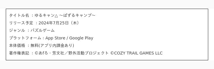 『ゆるキャン△ 〜ぱずるキャンプ〜』は、各務原なでしこ、志摩リン、大垣千明、犬山あおい、斉藤恵那、土岐綾乃など、TVアニメーション『ゆるキャン△ SEASON3』のキャラクターたちが登場する、時間制限式の3マッチパズルゲームになります。