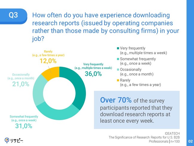 ワンストップでリサーチデータマーケティングを実現する「リサピー(R)?」(https://ideatech.jp/service/research-pr)を運営する株式会社IDEATECH(本社:東京都港区、代表取締役社長:石川友夫)は、BtoB事業を行う米国に所在する企業に勤務しており、調査レポートのダウンロード経験があるビジネスパーソン100名を対象に、米国BtoB企業における「調査レポート」に関する実態調査を実施しましたので、本リリースにて抜粋してお知らせいたします。