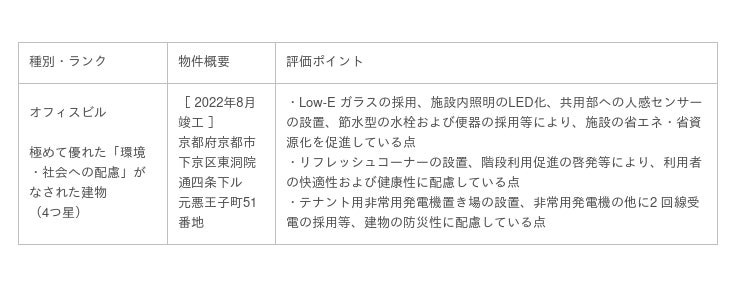 「DBJ Green Building 認証」取得物件・評価ランクおよび評価ポイント