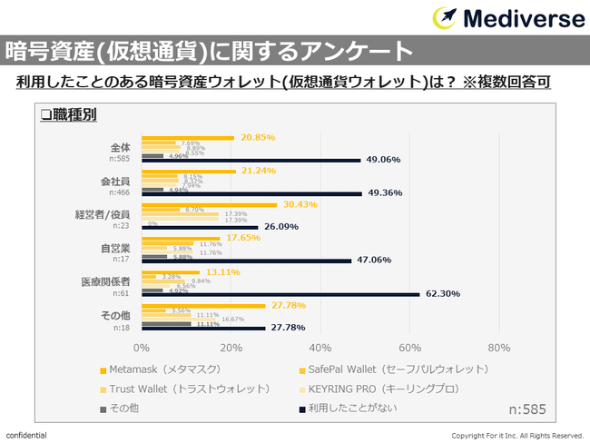 また、利用経験者の中で優位にあった「Metamask(メタマスク)」は経営者/役員の3割以上が回答しており、他職種より割合が高い傾向にあった。