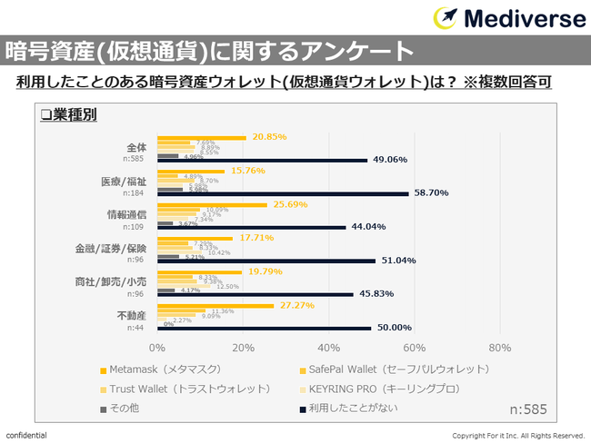 ・いずれの業種でも「利用経験なし」が上位を占めており、「Metamask(メタマスク)」と回答した割合が全体平均を上回っていたのは不動産27.27%、情報通信25.69%だった