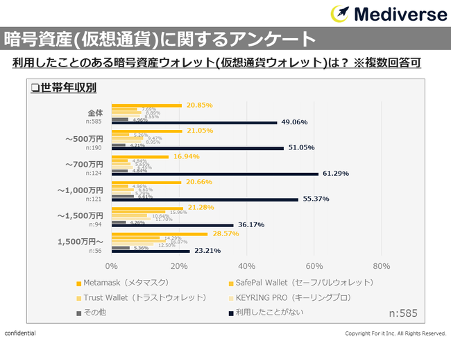 ・年収1,500万円以上の年収層のみ「Metamask(メタマスク)」28.57%が「利用経験なし」23.21%を抜き出る結果となった。さらに、「Trust Wallet(トラストウォレット)」が全体平均の2倍近くを占め、「KEYRING PRO(キーリングプロ)」の利用割合がもっとも高かったのもこの年収層のみである。